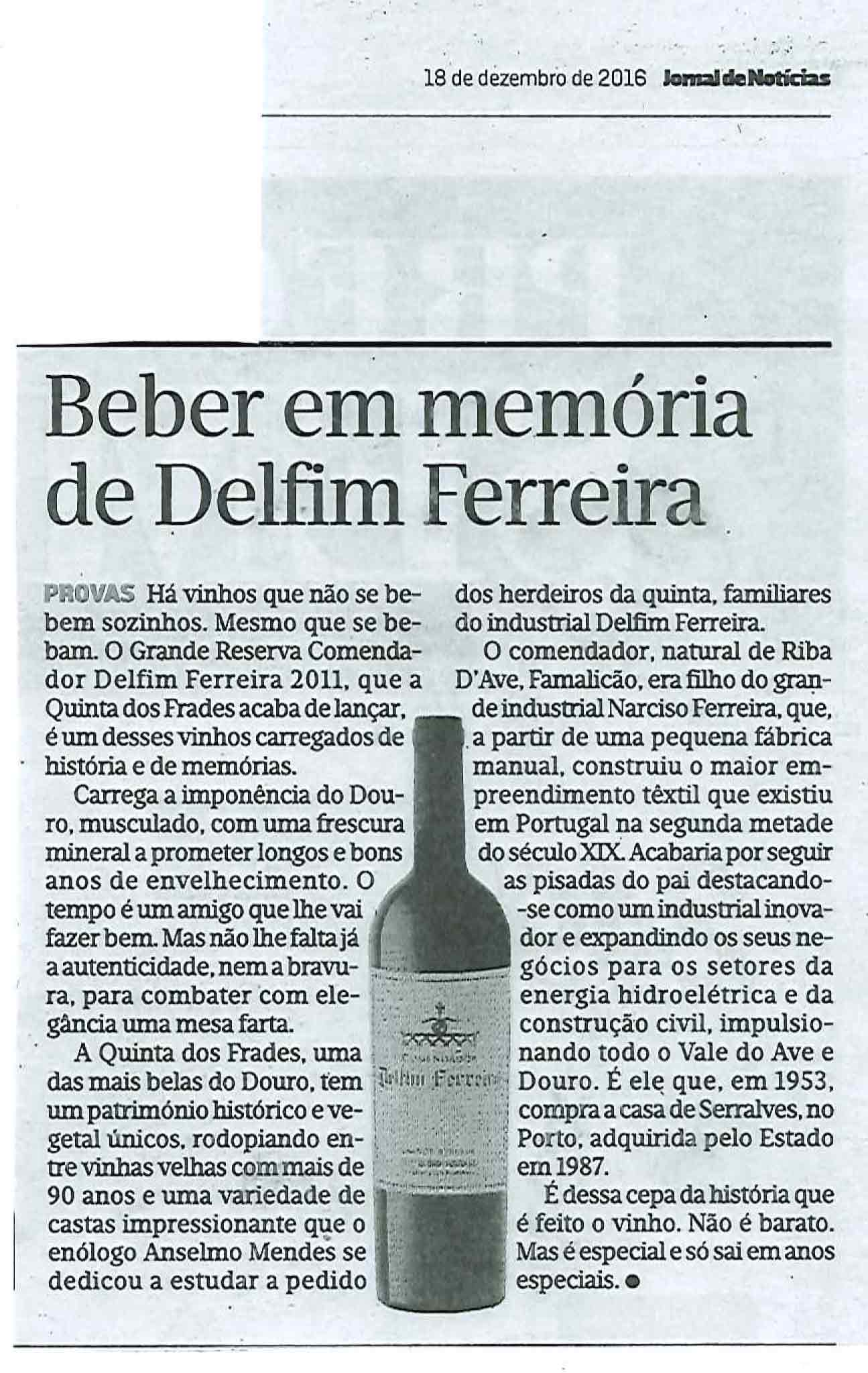 Special review on the Comendador Delfim Ferreira wine 2011 published in the Tasting section of the newspaper Jornal de Notícias of December, 18th 2016.