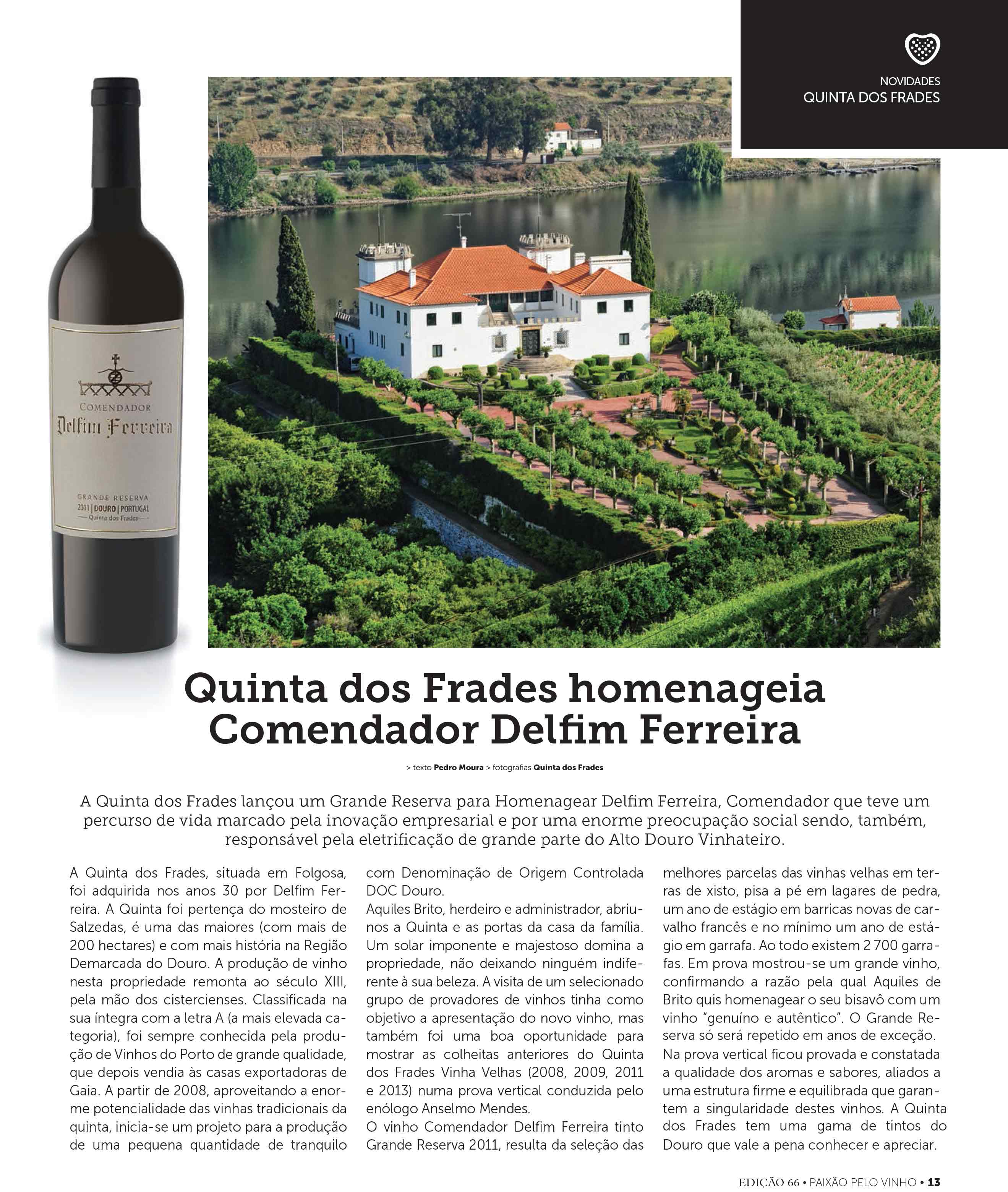 Special review on the Comendador Delfim Ferreira wine in the magazine Paixão pelo Vinho, edition 66 of July/August/September 2016